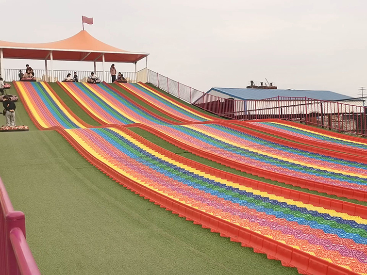 “彩虹飞渡・七彩旱滑滑道” 是专为亲子景区、城市乐园及乡村营地打造的高人气无动力滑跃地标。它以彩虹色拼接的耐磨滑道为核心,采用多轨并行设计,依托缓坡地形打造出兼具视觉冲击力与滑行快感的户外体验空间。