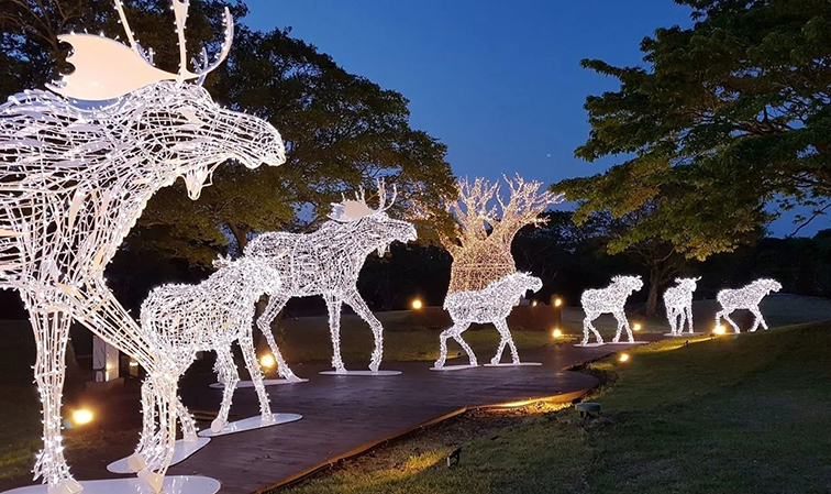 这是一款以鹿群迁徙为主题的夜间发光艺术装置,采用金属线材编织出动态感十足的鹿形雕塑,内置暖柔光源。夜晚点亮时,银白的鹿群仿佛穿梭于林间,与草地、树木背景自然融合,兼具艺术感与治愈氛围。