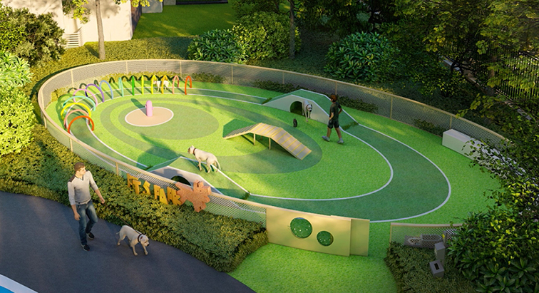 它兼具宠物游乐、社交与主人休憩功能:彩虹隧道与坡道可锻炼宠物的探索欲与肢体协调,开阔草坪满足奔跑需求,安全围栏保障宠物活动安全;主人可在围栏外或场地内陪伴互动,是宠物社交、主人交流的温馨空间。