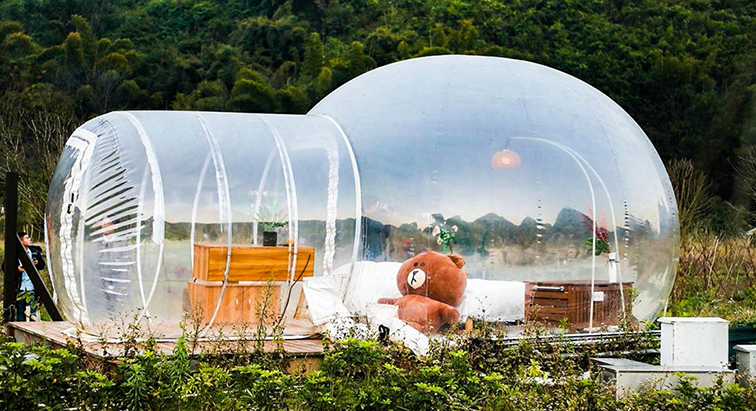 这是一款充气式透明景观配套设备,采用高透耐磨的 PVC 材质,以球形 + 筒形的组合打造出 360° 通透的空间,搭配木质平台与自然环境融合,视觉上如悬浮于山野的气泡,充满浪漫感与野奢氛围。