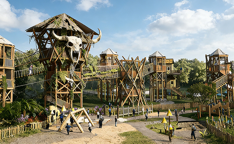 这是一款沉浸式原始部落风室外拓展游乐设备,以巨型牛头图腾树屋为核心,打造出多层错落的木质树屋群与高空栈道,搭配茅草屋顶与仿真绿植,营造出神秘的蛮荒部落氛围。主体采用环保防腐实木搭建树屋与栈道,搭配玻璃钢图腾雕塑与钢索系统,既还原了部落的质朴野性,又保障了结构稳固与游玩安全。设备集高空行走、树屋探索、亲子互动于一体,适用于主题乐园、自然景区、研学基地等场景,让孩子们在沉浸式的部落探险中,锻炼体能、勇气与团队协作能力,开启一段充满原始魅力的探险之旅。
