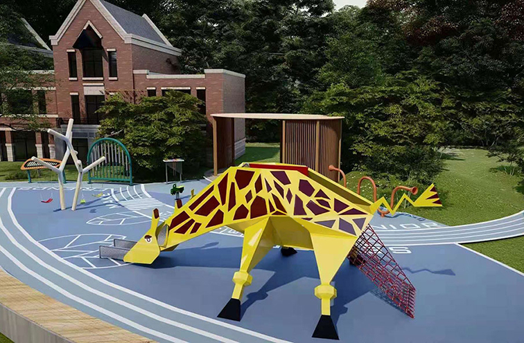 “几何长颈鹿・萌趣探险站” 是专为 3-8 岁低龄儿童打造的无动力拓展设备,以几何化长颈鹿为核心造型,将攀爬网、滑梯与钻爬通道等功能巧妙融入动物轮廓中。明快的黄紫撞色设计在户外场地中极具辨识度,全圆角与无尖锐边角的细节处理,让孩子在与 “长颈鹿伙伴” 互动玩耍时,既能锻炼肢体协调与探索能力,又能获得全方位的安全守护。