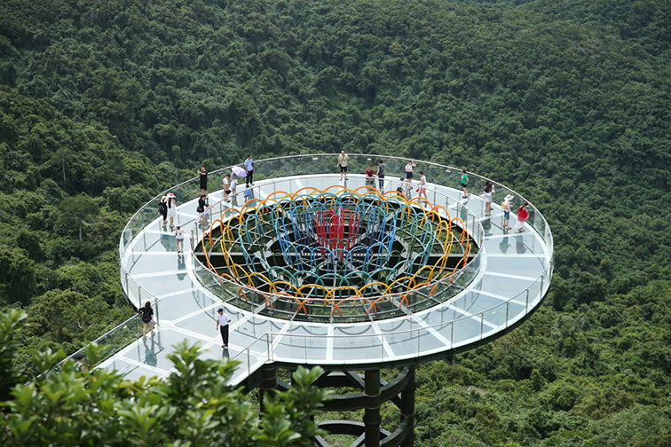 设计亮点:全透明玻璃与钢结构支撑,既保证了观景通透性,又通过中央彩色装置强化了视觉焦点,适配全年龄段游客,兼具观景与轻探险属性。