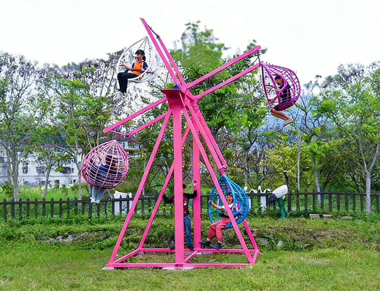 设计亮点:亮眼的粉色主架与多彩吊篮形成强烈视觉冲击,开放式网格座舱既保证了通风与视野,又充满了 “鸟巢” 般的包裹感,适配 3-12 岁儿童。