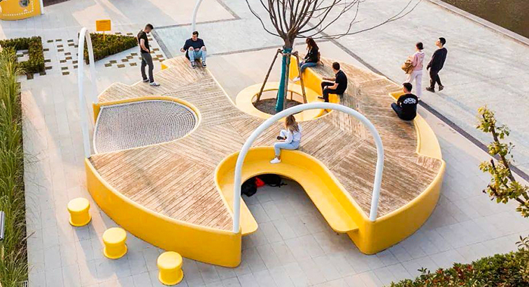 这是一款兼具休憩、社交与轻互动功能的公共景观装置,以流畅的曲线造型为核心,黄色玻璃钢底座搭配木质防滑面板,围绕中心树池打造出多层次的坐卧空间,还融入了迷你滑梯模块,视觉上充满活力与现代感。